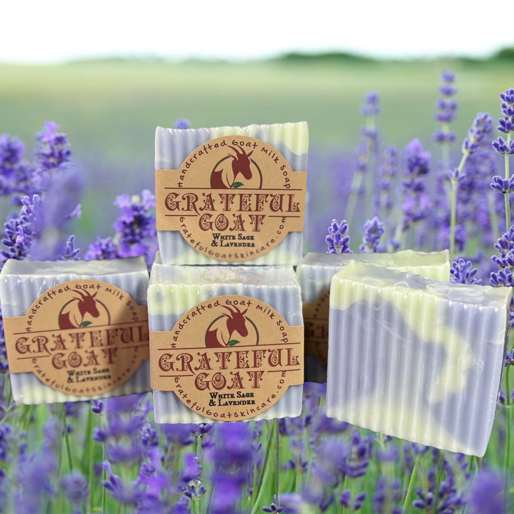 Our handcrafted goat's milk soap is a hefty 5-6oz. White Sage and Lavender is a calming and fresh blend of herbs, lavender, and aromatic woods. Sage, rosemary, and chamomile awaken the earthiness of lavender, while hints of sandalwood and cedar in the base are reinforced by clove, lavandin, and cedarwood essential oils.