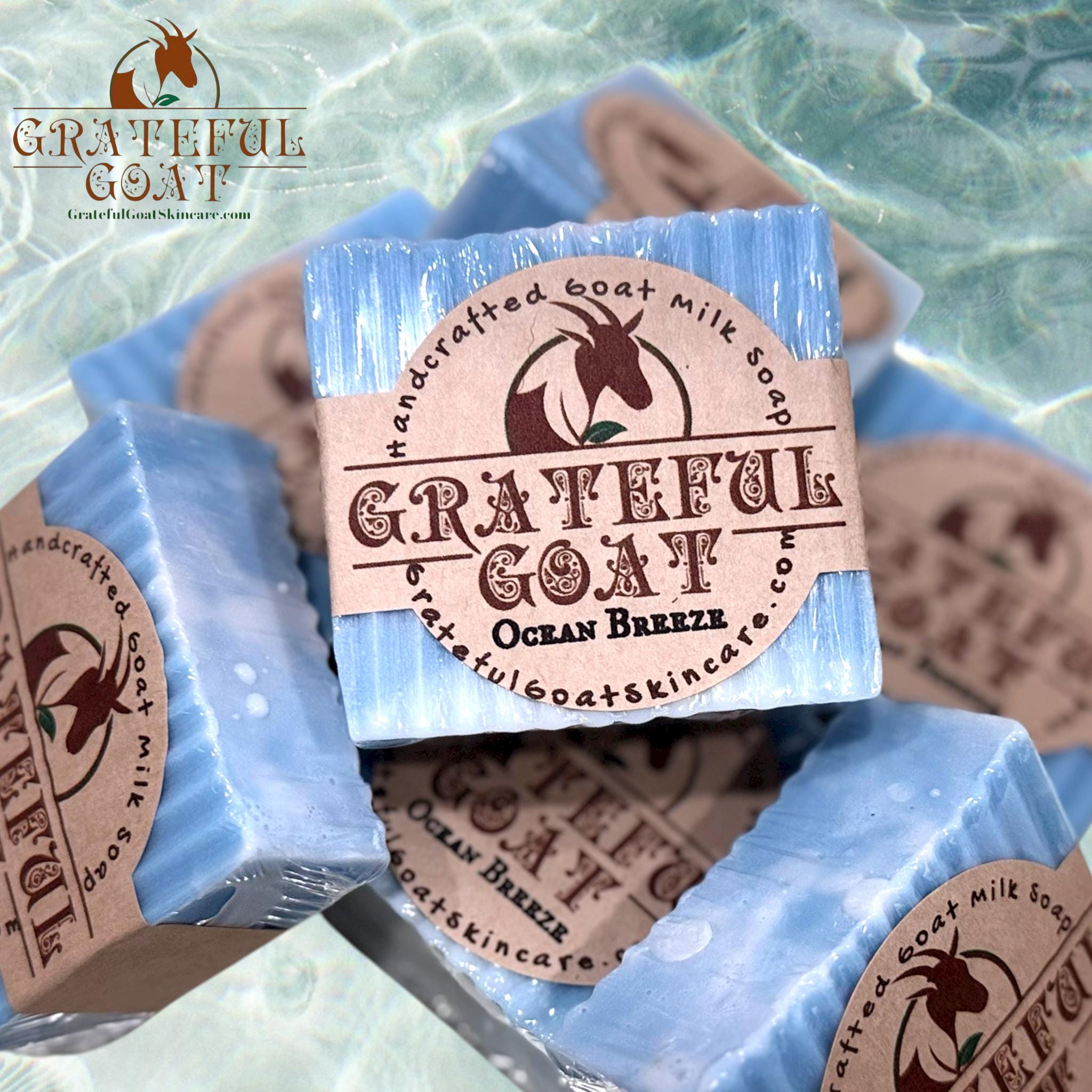 Our handcrafted goat's milk soap is a hefty 5-6oz. Ocean Breeze is a crisp and clean escape to a salty ocean breeze. Rich heart of sea salt rests on an aquatic base of palm, light musk and amber, making this a irresistible must-have fragrance for both men and women.
