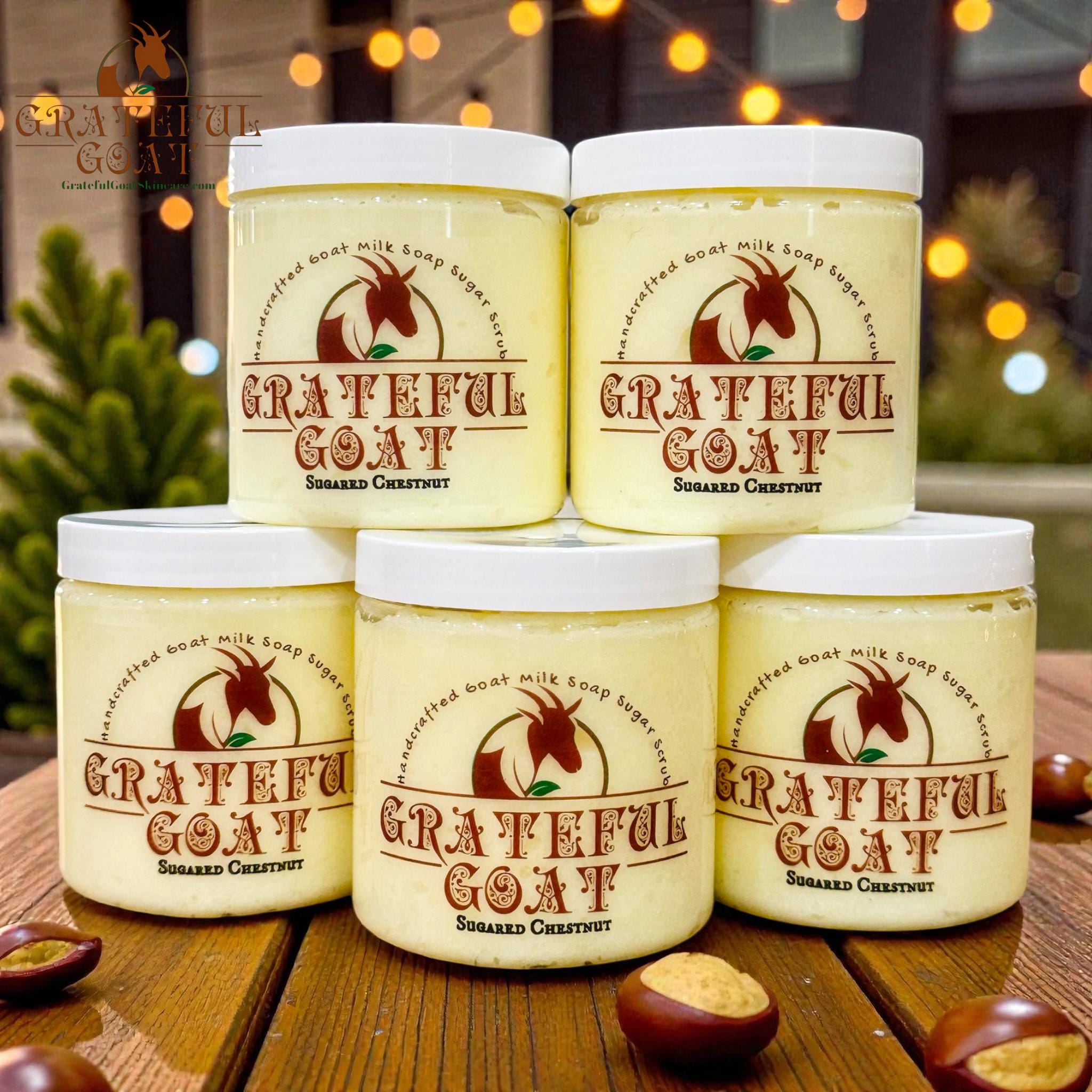 Our 8oz Whipped Goat Milk Sugar Scrub is an amazing is an ALL-IN-ONE exfoliant, cleanser and nourishing moisturizer. Made simply with our whipped goat milk soap, organic raw sugar, natural jojoba oil and essential oils. Sugared Chestnut is warm and sweet with top notes of cinnamon and vanilla merged with chestnuts, cozy amaretto and with a base of caramelized sugar, butter and tonka.